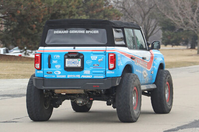 Its bright blue livery and branding is enough to attract attention. Among the OE supplier and aftermarket signage along the sheetmetal are logos from Dana/Spicer Corp., Warn Industries, Rigid, ARB and Expedition Vehicle Outfitters. The Bronco is said to be rolling on 40-in. tires on a set of bead-lock wheels. Ford is expected to showcase the Bronco at upcoming events and auto shows.
