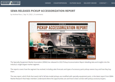 Jobber Nation, a Canadian publication for automotive aftermarket wholesale and distribution professionals, pointed out that the report covers how the pickup segment has evolved, including sales forecasts and types of accessory parts pickup owners buy and how they buy them. It also encouraged its readers to attend SEMA’s webinar related to the report.