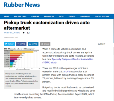 Download the “2022 SEMA Pickup Accessorization Report” at www.sema.org/research. The following are some of the publications that reported on the research.