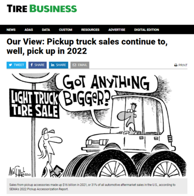 “Customization has become a key reason why consumers like owning pickups, and aftermarket sales show it to be true,” read the opinion piece by Tire Business editors, who also stated that this might be a good time for tire dealers to reset and educate their sales team so they can establish longtime business relationships.”