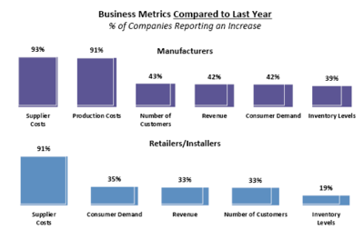 More than 90% of companies are reporting a rise in supplier and production costs, but demand and revenue remain strong. Companies are passing these costs to customers.