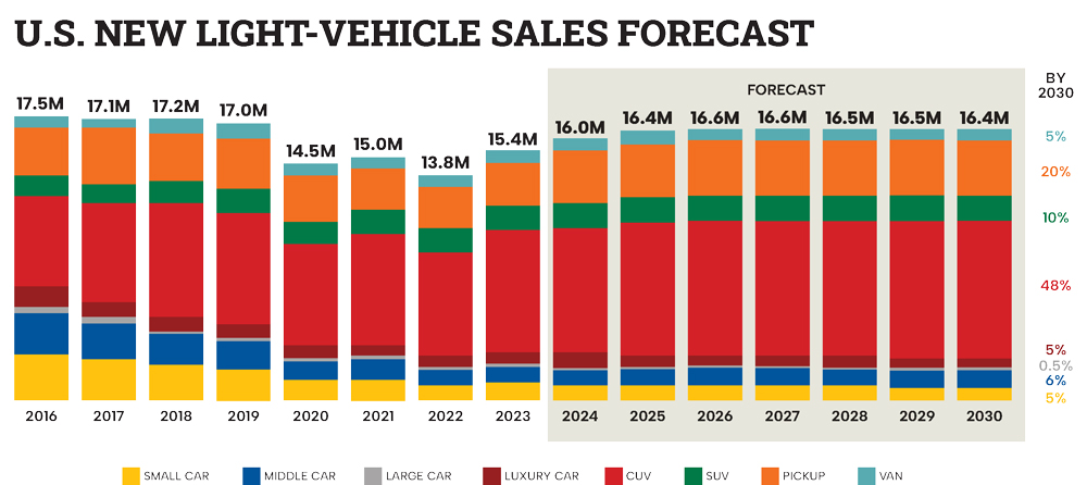 “The number-one vehicle trend to talk about is the COVID-related supply-chain disruptions and the drop in vehicle production and sales over the last few years,” observed Knapp. “Thankfully, that’s working its way out. Over the next few years, we’ll probably get back up to a maximum production of about 16.5 million new vehicles for the United States. That’s not quite the 17-million-plus production of a few years back, but we’re definitely getting back to having a lot more vehicles on the lot now, with virtually full recovery by 2026.”