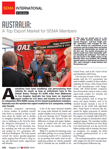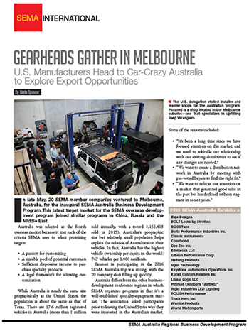 Participants can explore this market of true gearheads and the opportunities for manufacturers of sought after products for SUV/Pickup trucks, street performance, and racing. Rumor has it that they have more hot rodders per capita in Australia than anywhere else in the world.