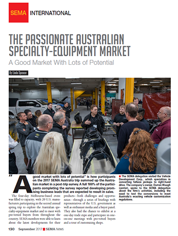 The SEMA Australia program fees include hotel, meals, networking events, briefings, a tour of specialty equipment shops and exhibiting at the MotorEx show in a turn-key booth.